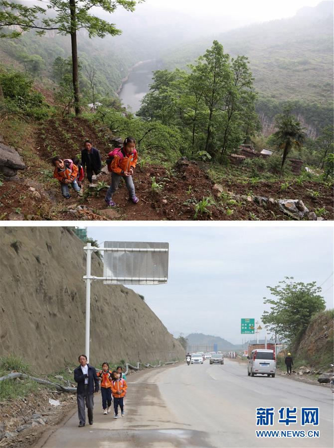 拼版照片:上图为教师杨绍书和学生们在崖壁上的小路行走,他们的身旁是六冲河峡谷(4月27日摄);下图为教师杨绍书和学生在县城公路上行走,前往新学校(5月7日摄)。新华社记者 欧东衢摄