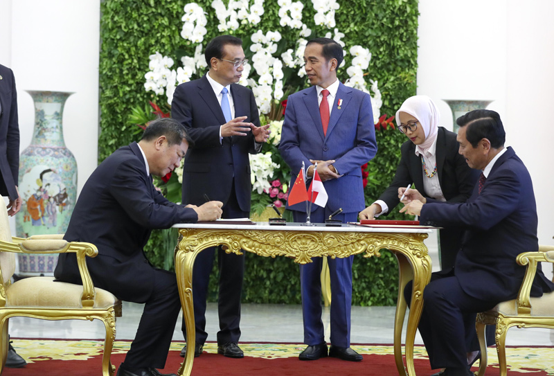 当地时间5月7日上午,国务院总理李克强在茂物总统府同印度尼西亚总统佐科举行会谈。会谈后,李克强与佐科共同见证了双方有关合作文件的签署。
