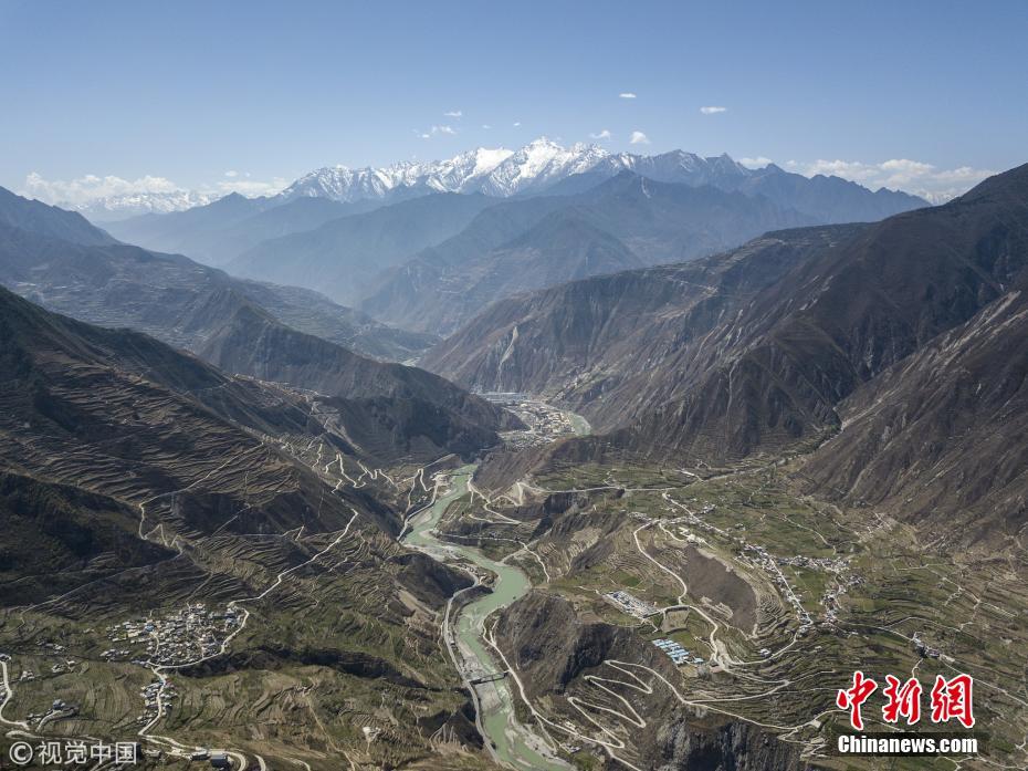 曾经惊心触目的地震遗迹也已渐渐被青草树木覆盖,渐渐与大自然合为一体,没有了当年惨烈痛心的感觉,但也从没人敢轻易忘记。图为岷江河水在汶川的大山之间蜿蜒流淌,远眺可见皑皑雪山,许多地震时候的痕迹已悄然被植被覆盖。 张由琼 摄 图片来源:视觉中国