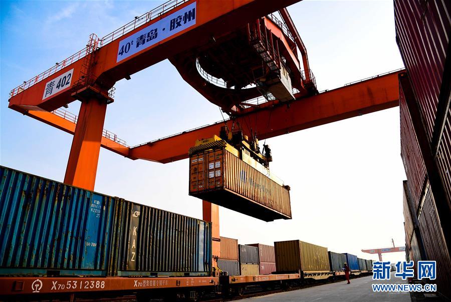 在青岛胶州湾国际物流园,龙门塔吊在往中亚班列上装载货物(5月7日摄)。该班列将通过阿拉山口至哈萨克斯坦的阿拉木图。新华社记者 郭绪雷 摄