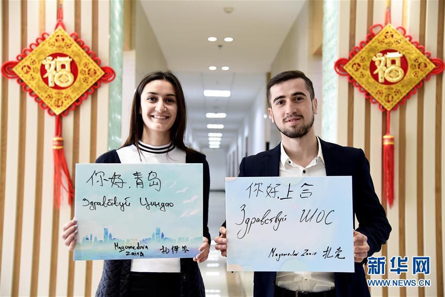 在位于青岛的中国石油大学(华东)学习的俄罗斯留学生扎克(右)和扎伊尔兄妹俩用汉语和母语写下“你好,上合”“你好,青岛”(5月3日摄)。 新华社记者 郭绪雷 摄