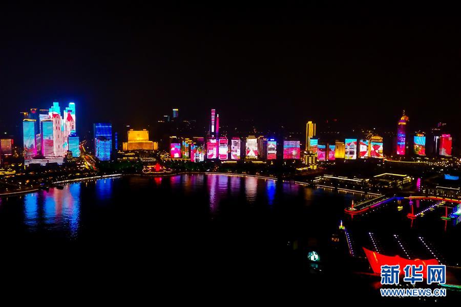 这是青岛浮山湾展现青岛风光的主题灯光秀(5月7日无人机拍摄)。 新华社记者 李紫恒 摄