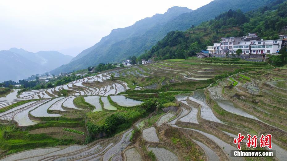 5月9日,尧龙山梯田高低错落,周围有房屋和树木点缀。尧龙山梯田位于贵州省遵义市桐梓县尧龙山镇。中新社发 瞿宏伦 摄