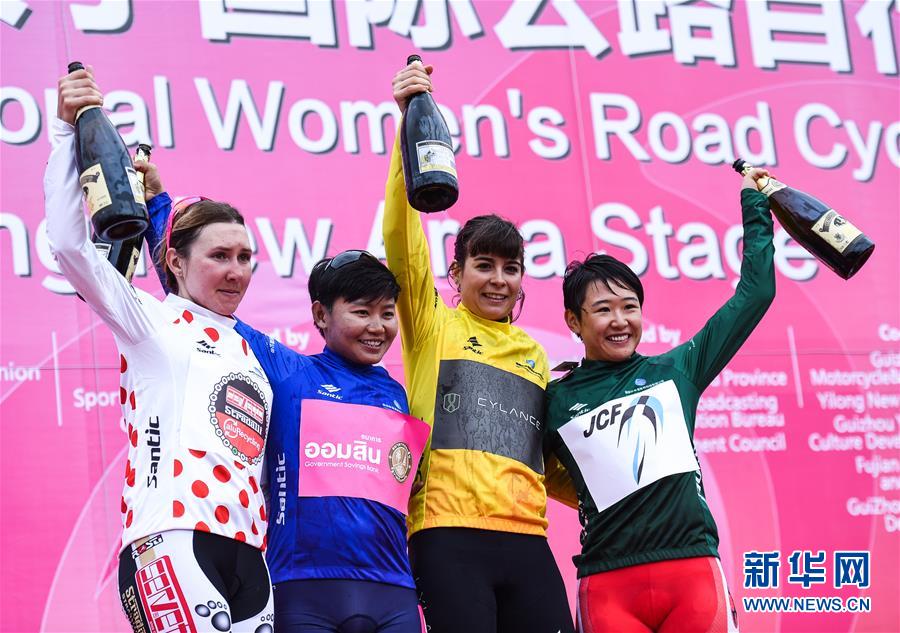 5月9日,(从右至左)获得冲刺总积分领先绿衫的日本队车手梶原悠未、获得黄色领骑衫的美国塞兰斯女子职业自行车队车手古铁雷斯、获得象征亚洲最佳蓝衫的泰国女子职业自行车队车手玛尼芬和获得赛段“爬坡王”圆点衫的意大利赛尔韦托女子职业自行车队车手多布瑞丽娜在第四赛段颁奖仪式上庆祝。当日,2018“全景贵州”女子国际公路自行车赛在贵州省兴义市义龙新区进行了第四赛段109.7公里的比赛。新华社记者陶亮摄