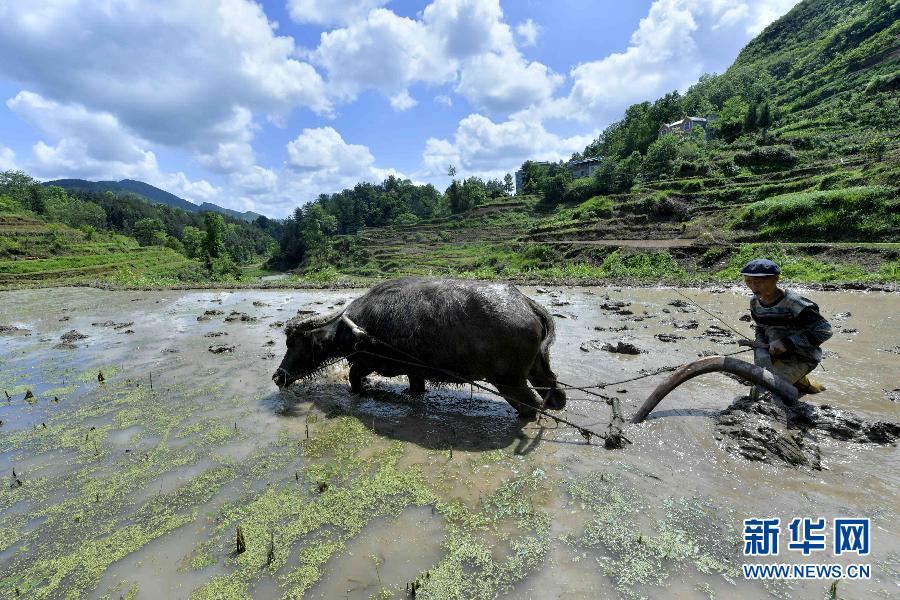 5月7日,湖北省宣恩县沙道沟镇当阳坪村农民在耕田准备插秧。