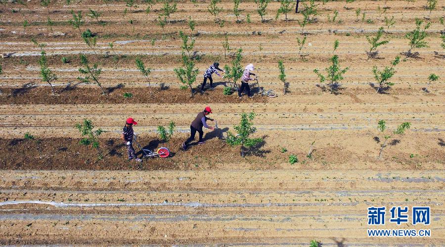 5月6日,河北唐山遵化市铁厂镇铁厂村农民在果园松土锄草(无人机拍摄)。