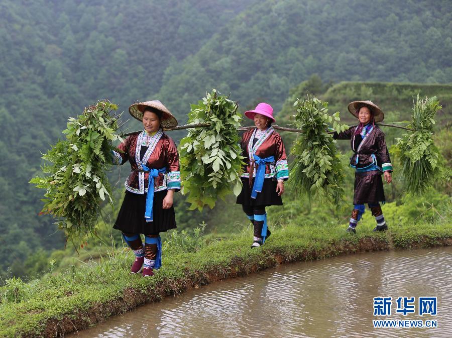 5月5日,在广西柳州市融水苗族自治县杆洞乡花孖村,苗家妇女在田间劳作。新华社记者黄孝邦 摄