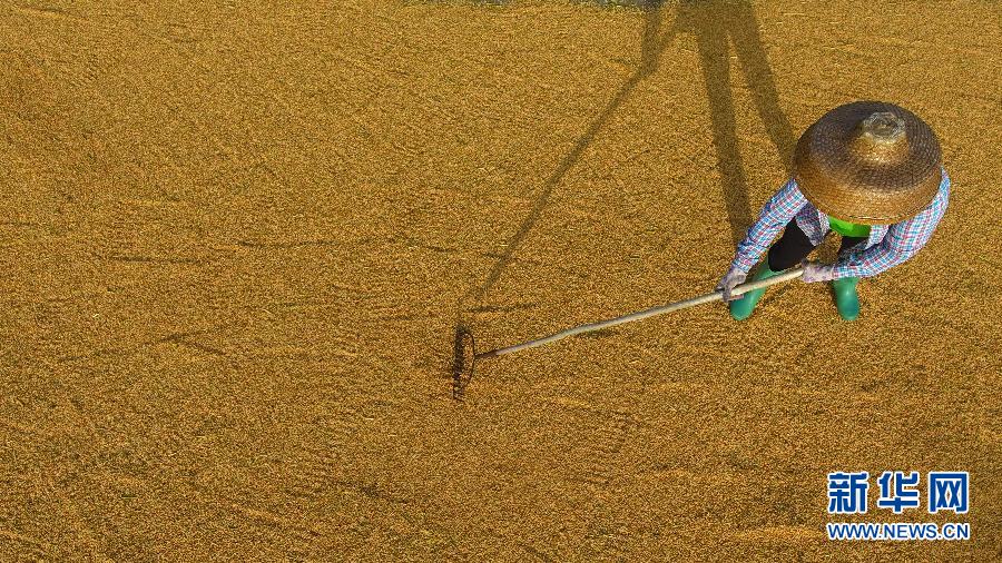 5月5日,海南省琼海市潭门镇福田村农民在晾晒收获的早稻。新华社发(蒙钟德 摄)