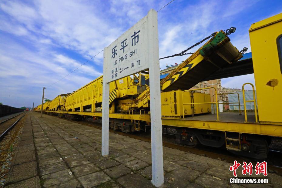 5月9日晚,随着皖赣铁路乐平火车站的一列大型养路机械鸣笛驶出车站,皖赣铁路乐平至万年区间迎来了2018年首次大型机械化维修施工作业。皖赣铁路起始江西省鹰潭市贵溪市至安徽省芜湖市,北连宁铜铁路和淮南铁路,南接沪昆铁路和鹰厦铁路,是沟通江西、安徽两省的铁路干线,全长550千米,被称为“华东第二通道”。图为5月9日傍晚,鹰潭工务机械段大型养路机械在乐平站内等待进入施工地段进行施工作业。 汪翰 摄