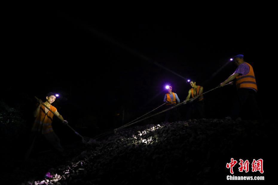 5月9日晚,随着皖赣铁路乐平火车站的一列大型养路机械鸣笛驶出车站,皖赣铁路乐平至万年区间迎来了2018年首次大型机械化维修施工作业。皖赣铁路起始江西省鹰潭市贵溪市至安徽省芜湖市,北连宁铜铁路和淮南铁路,南接沪昆铁路和鹰厦铁路,是沟通江西、安徽两省的铁路干线,全长550千米,被称为“华东第二通道”。图为鹰潭工务机械段工人们正对作业后线路进行整理作业。 汪翰 摄