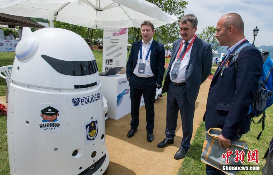 5月10日,与会人员观看警用机器人。当日,以“知行合一,让AI与机器人更融合”为主题的第五届中国机器人峰会暨智能经济人才峰会在浙江省宁波余姚举行。这场万众瞩目的机器人行业盛会吸引了包括全球69位顶级专家学者、220位知名制造企业高层在内的1500余位业界精英出席,共商机器人行业和智能经济发展大计。 中新社记者 何蒋勇 摄