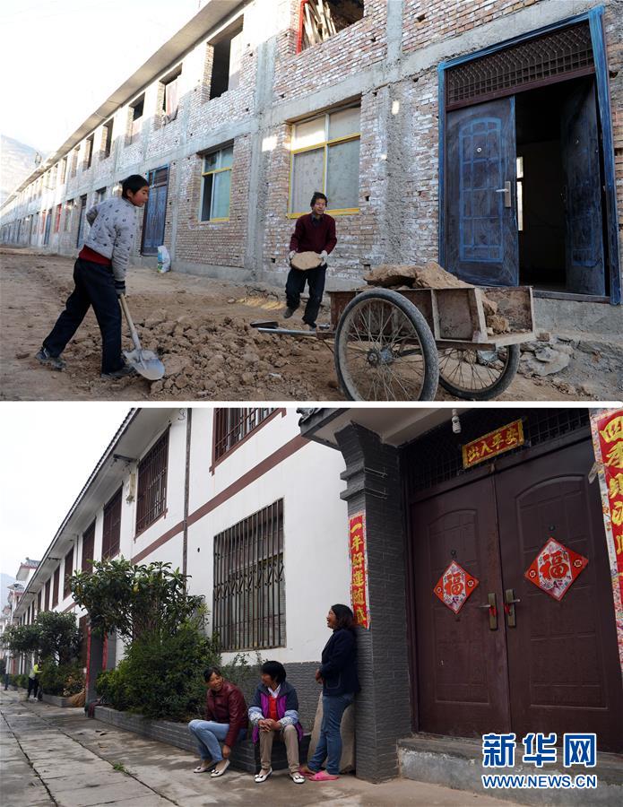 这是一张拼版照片,上图为2009年1月24日,甘肃陇南武都区马街镇感恩村村民在新建的村中平整街道(新华社记者马宁摄);下图为2018年5月9日,感恩村村民在村中聊天(新华社记者范培珅摄)。