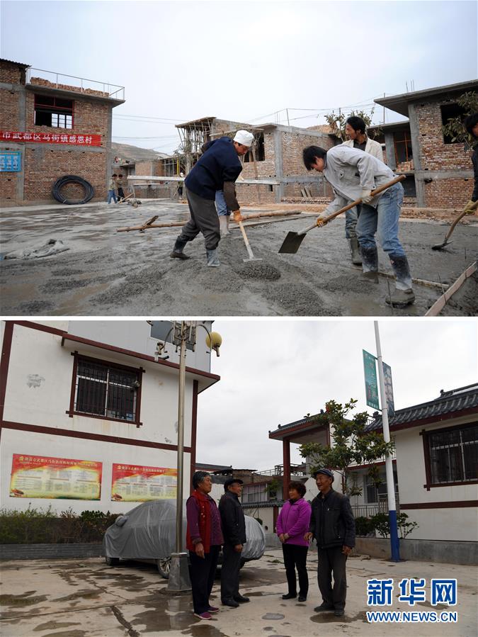这是一张拼版照片,上图为2009年4月25日,感恩村村民在硬化感恩村村前的道路(新华社记者聂建江摄);下图为2018年5月9日,感恩村村民在村前道路上聊天(新华社记者范培珅摄)。