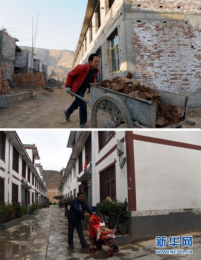这是一张拼版照片,上图为2009年1月24日,甘肃陇南武都区马街镇感恩村的村民在村中平整街道(新华社记者马宁摄);下图为2018年5月9日,感恩村村民推着幼儿在村中街道散步(新华社记者范培珅摄)。