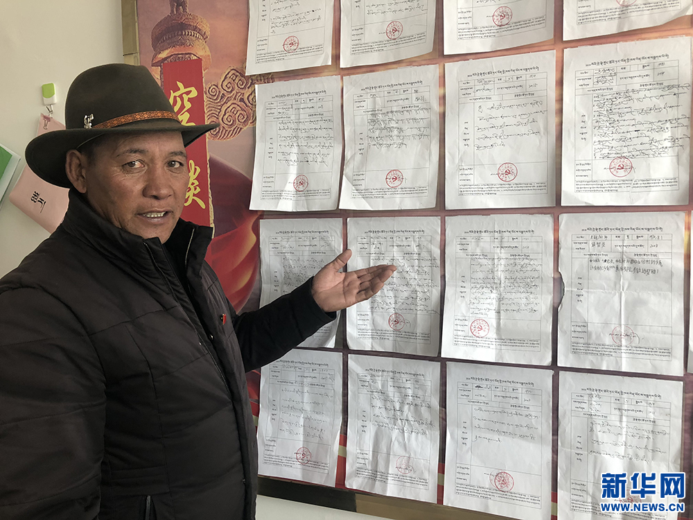 村委会书记次旺欧珠向记者介绍赤德村党支部党员公开承诺的任务。新华网 雪珍 摄