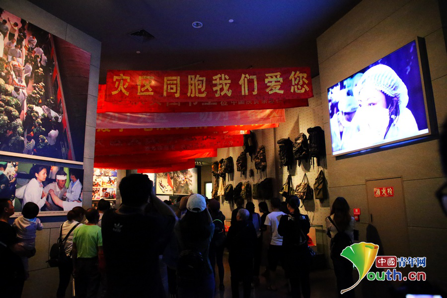 5·12汶川特大地震纪念馆内展示的震后全国人民支援震区的标语。高寒 摄