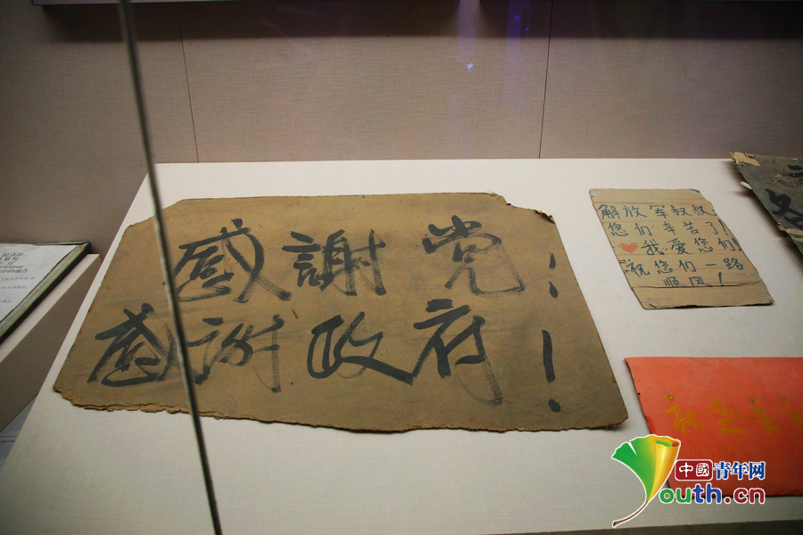 5·12汶川特大地震纪念馆内展示的灾区人民书写的标语:感谢党!感谢政府!高寒 摄