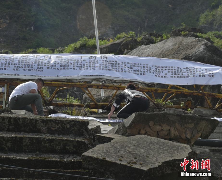 北川中学幸存者挂上横幅,缅怀遇难师生。 杨勇 摄