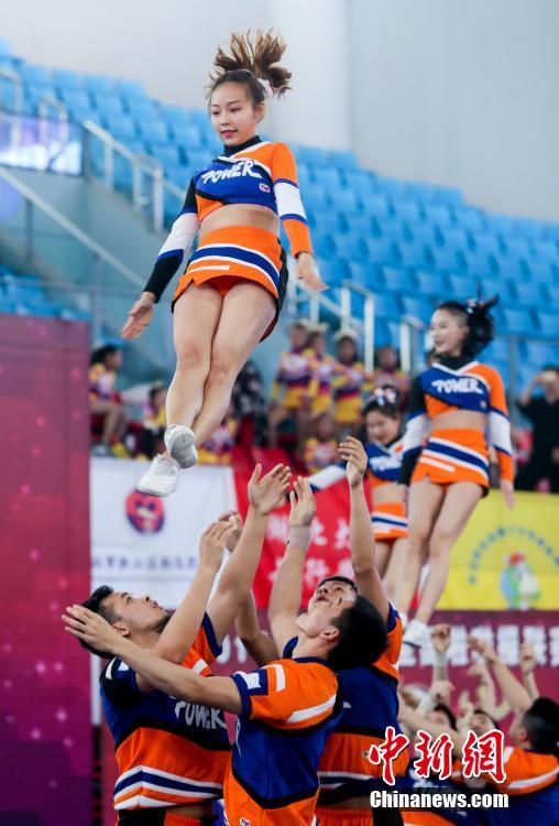 5月12日,参加啦啦操比赛的选手正在比赛中。当日,2017-2018年中国啦啦操联赛(武汉站)在武汉市洪山区文体中心体育馆举行。来自全国各地的131支啦啦操队将分别参加幼儿、小学、中学和大学组赛事,同台竞技尽展活力。 中新社记者 张畅 摄