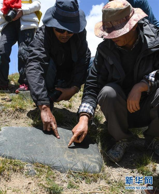 考察人员在查看称多县称文镇白龙村科哇岩画点的遗迹(5月14日摄)。新华社记者 李贺 摄 图片来源:新华网