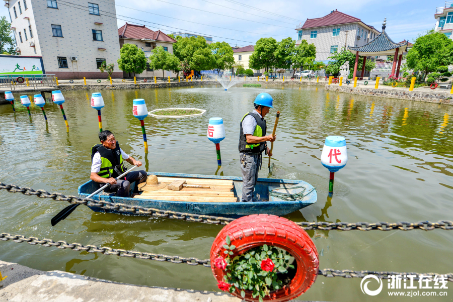 5月16日,长兴县李家巷镇许家浜村吴家潭碧水潺潺、绿意盎然,保洁人员正在进行护水作业。李家巷镇按照“一村一品”“一村一景”“一村一业”的要求,在美丽乡村建设过程中,不搞大拆大建,结合五水共治、垃圾分类、四边三化、三改一拆等工作,打造15个亮点水体,并充分利用旧轮胎、酒坛等废弃垃圾,对水体及村庄景观进行美化,打造美丽乡村升级版。