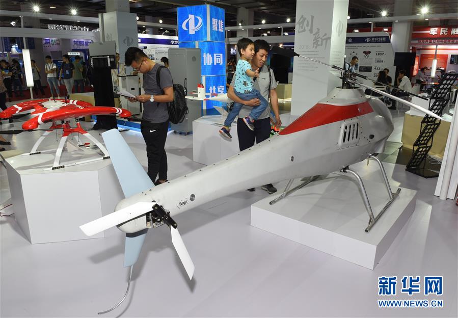 5月17日,观众观看一款50公斤载荷无人直升机。新华社记者罗晓光摄