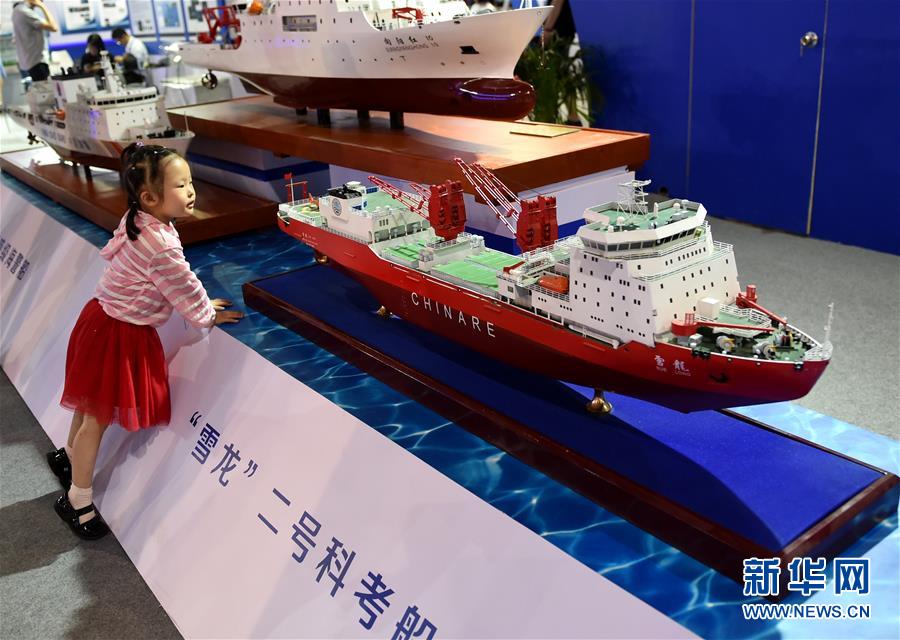 5月17日,一名小朋友在仔细打量“雪龙”二号科考船模型。新华社记者罗晓光摄