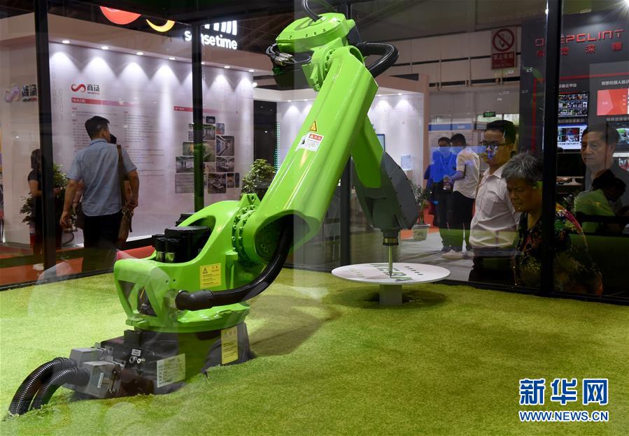 5月17日,观众观看一台六关节机器人工作演示。新华社记者罗晓光摄