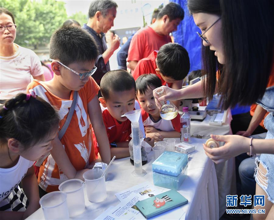 5月20日,科普志愿者在中科院成都分院活动现场向小朋友们演示碳的吸附作用。新华社记者刘坤摄