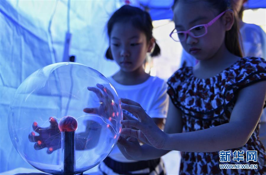 5月20日,两名小朋友在中科院成都分院活动现场体验电离子魔灯。新华社记者刘坤摄