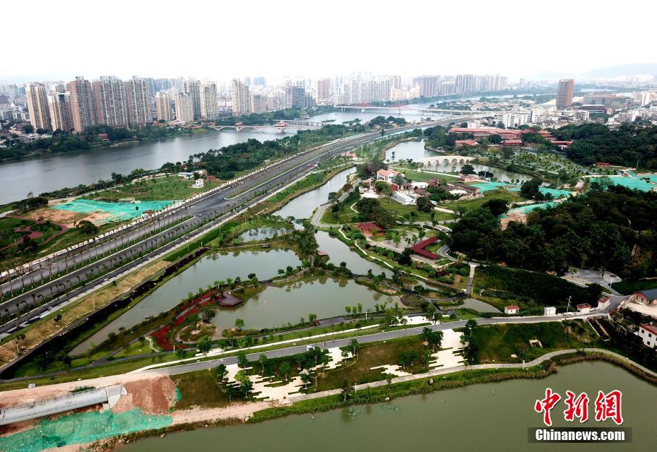近年来,漳州市紧紧围绕“田园都市、生态之城”的发展定位,着力将“生态+”具体化、项目化,在中心城区全力加快由碧湖、西湖、西院湖、九十九湾湖、南湖和荔枝海、香蕉海、水仙花海、四季花海组成的“五湖四海”项目建设。做到城中有林、城中有花、城中有湖。图为5月21日,航拍漳州九龙江两岸的高楼和生态公园。 中新社记者 王东明 摄