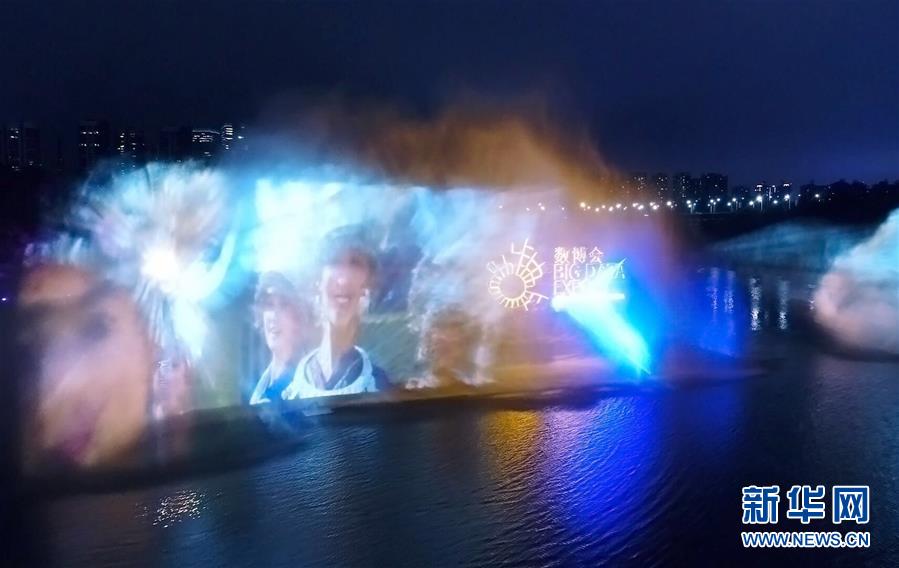 市民在贵阳市观山湖公园内体验数谷之夜活动中的水幕电影(5月22日摄)。新华社记者刘续摄