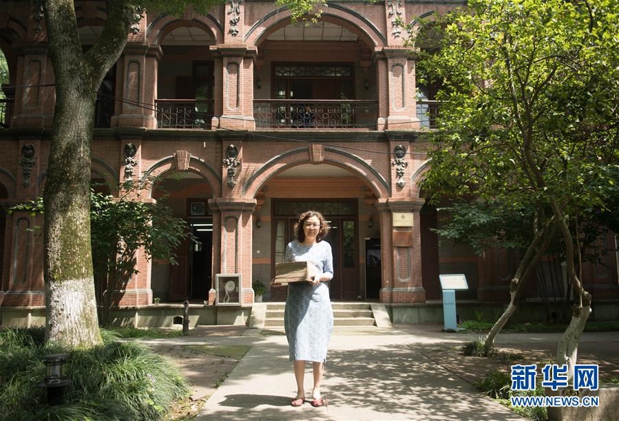 5月23日,阎静书在浙江图书馆国家级古籍修复中心所在的建筑旁留影。新华社记者翁忻旸摄