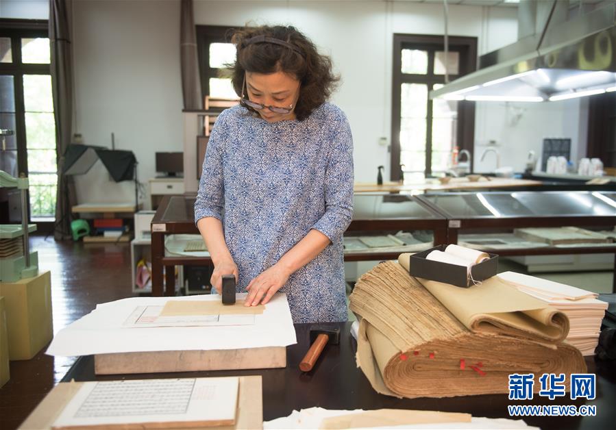 5月23日,阎静书将修补好的书叶锤平。新华社记者翁忻旸摄
