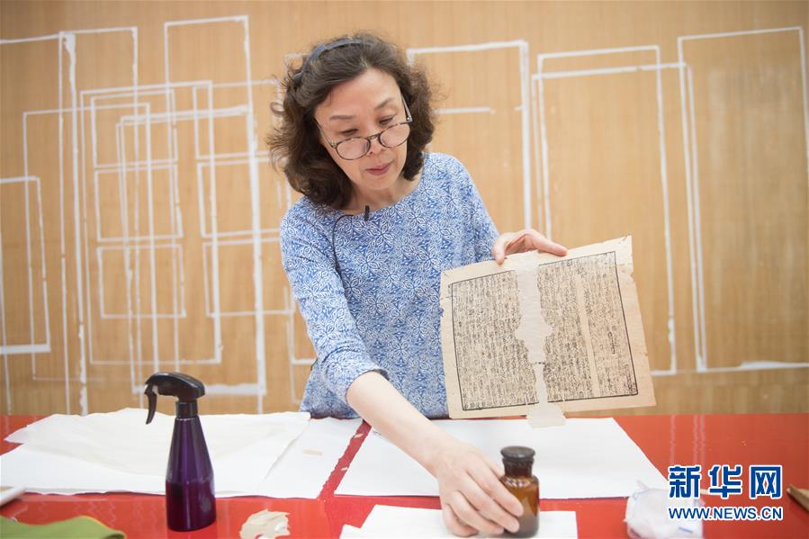 5月23日,阎静书展示正在修复的元刻本古籍。新华社记者翁忻旸摄