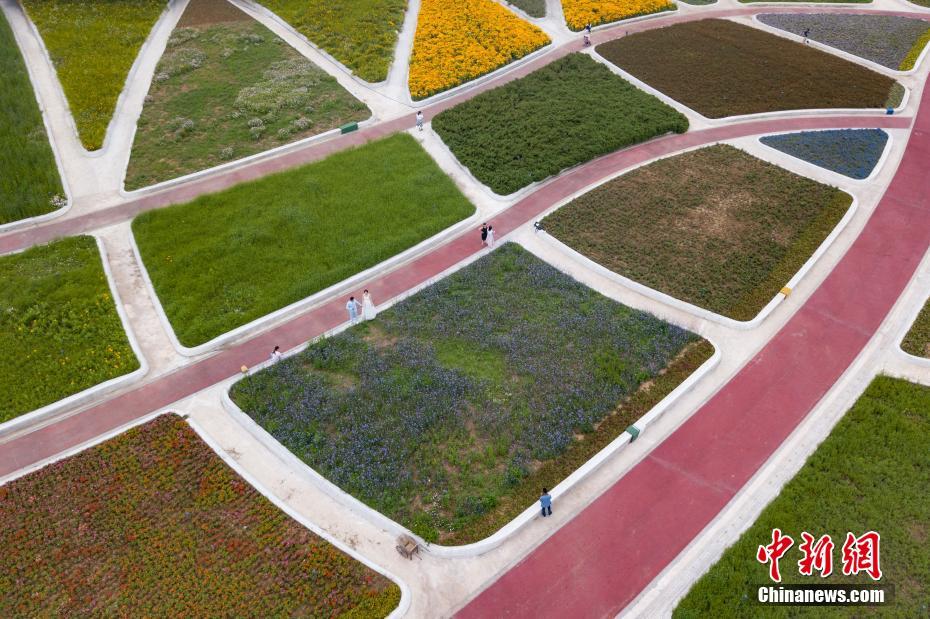 5月24日,航拍长江南京段南岸一处花海,各种颜色的花卉次第开放,俯瞰宛如镶嵌在地面上的水彩调色盘,五彩缤纷美不胜收。 中新社记者 泱波 摄