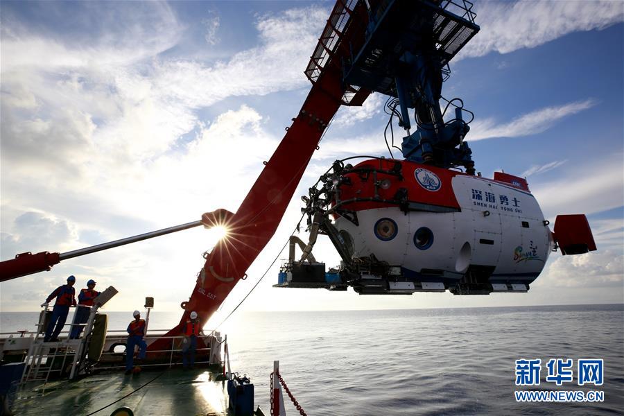 5月23日,“深海勇士”号完成西沙深潜航次的最后一次下潜任务回到母船。新华社记者 张建松摄