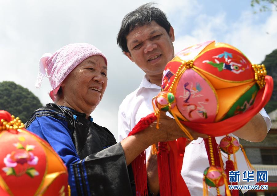 每天,来往于广西靖西市新靖镇旧州街的市民游客,都会看到这样一个温馨的画面:年过七旬的老人坐在家门口,一针一线地制作着手中的绣球,那认真又悠闲的神情,成为这条老街一道迷人的风景线。这位老人名叫黄肖琴,今年73岁,从小爱好刺绣、制作绣球,直到今天依然针线不离手,一有空就坐在家门口做绣球。1995年,她在首届中华巧女手工艺术品大奖赛中获奖,此后还先后荣获“中国民间文化杰出传承人”“广西非物质文化遗产项目靖西壮族绣球制作技艺代表性传承人”“广西民间工艺艺术师”等称号。新华社记者陆波岸 摄