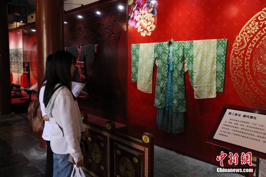 5月25日,《鸾凤和鸣——汉文化传统婚俗展》在黑龙江省民族博物馆开展。展览现场设置了“周代士婚礼”、“唐代婚礼”、“明代婚礼”、互动体验四部分内容。该展精选了华夏五千年文明中最具代表性婚礼习俗,通过文物陈列、婚服展示、文字介绍等方式,将抽象的婚礼文化转化为通俗易懂、趣味十足的互动展览。图为民众参观婚俗展。 中新社记者 于琨 摄