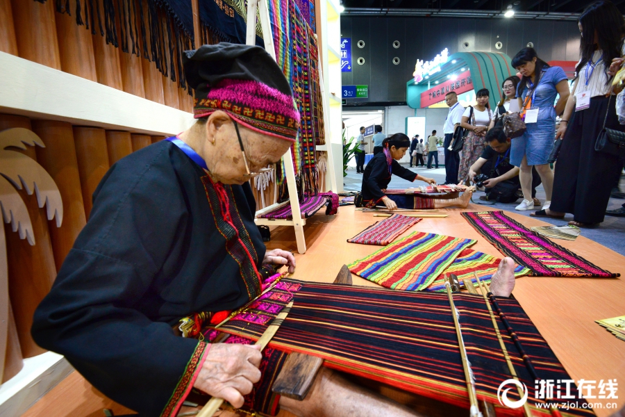 海南馆,国家级非遗传承人现场展示黎族传统纺染织绣技艺。