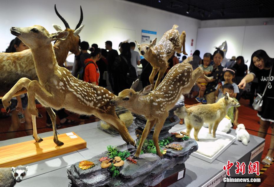 5月27日,各类飞禽走兽活灵活现地出现在民众的眼前。正在福建博物院展出的第四届中国动物标本大赛的257件惟妙惟肖的标本作品集中对外开放,让民众如进入“动物世界”。本次大赛汇集了全国标本制作企业、博物馆、大专院校、研究所等60多家单位参加,标本涵盖哺乳类、鸟类、爬行类、两栖类、鱼类等动物类群的皮张和骨骼标本。主办方希望通过标本大赛,向公众展现动物世界的美丽,宣传生物多样性和生态文明,借鉴吸收国际标本制作先进经验,提高中国野生动植物标本制作的整体水平。图为大赛参赛作品展吸引了许多民众前来观赏。 中新社记者 张斌 摄