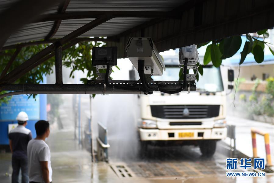 在南宁市一家搅拌站,连接到扬尘治理视频综合管理系统的摄像头实时监控进出车辆清洗情况(5月25日摄)。