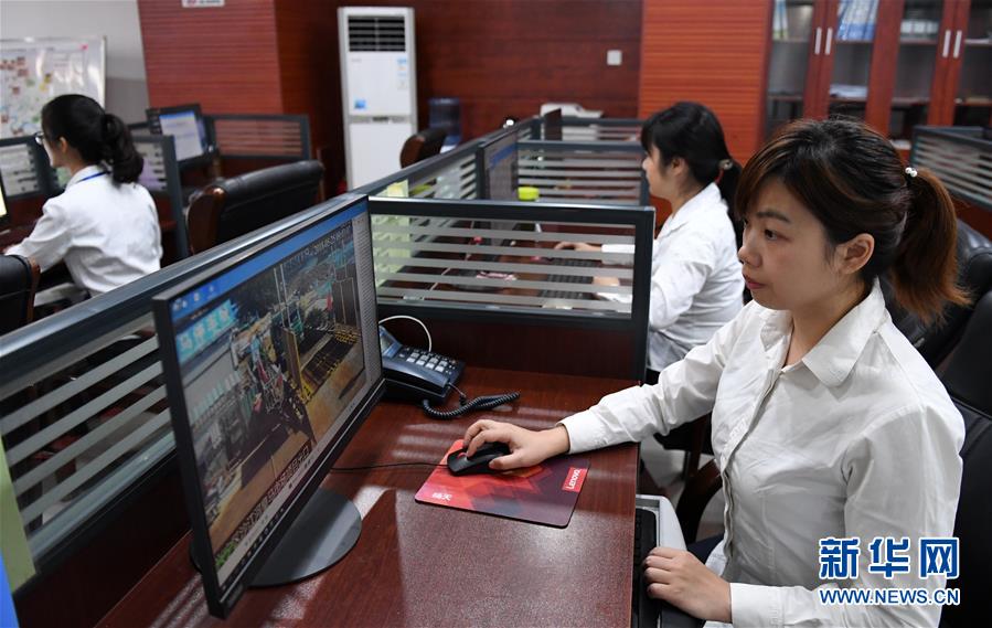 在南宁市扬尘治理视频综合管理系统值班座席,工作人员通过视频监控扬尘治理情况(5月25日摄)。