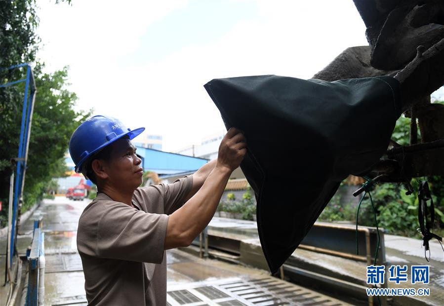 在南宁市一家搅拌站,工作人员给准备出站的车辆泥浆出口套上袋子防止泥浆漏出(5月25日摄)。