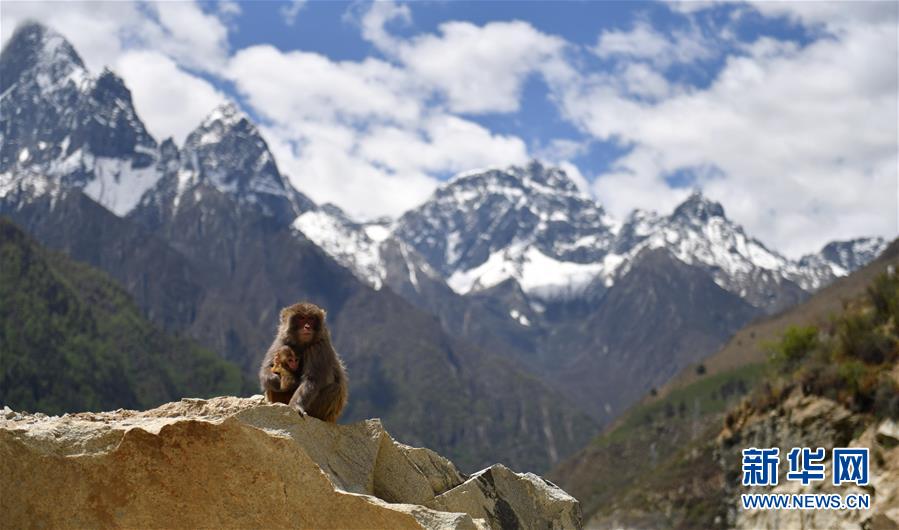 野猴在306省道山南市加查县段路边休息(5月23日摄)。 新华社记者 晋美多吉 摄
