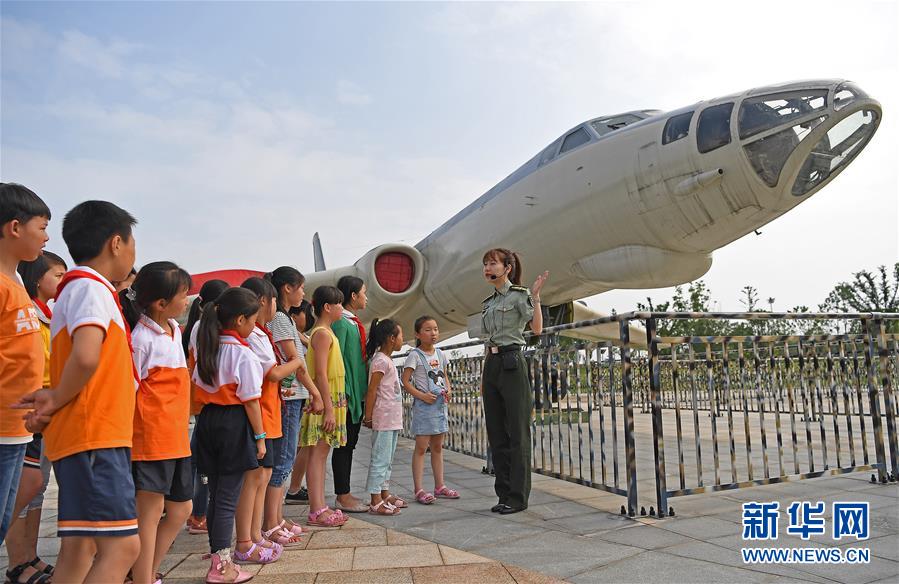 5月28日,南昌军事装备展示中心的讲解员(右一)向孩子们介绍展示的军事装备。新华社记者 万象 摄