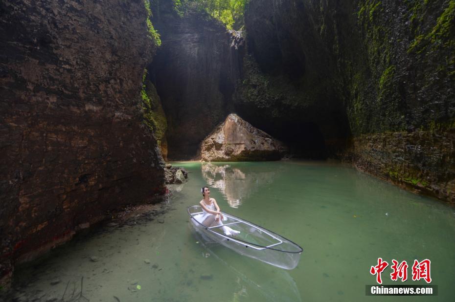 芭蕾舞者在山洞内的透明船上起舞。杨华峰 摄