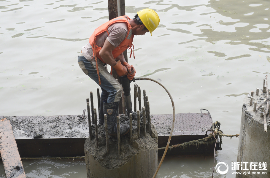 5月30日,位于杭州余杭区博陆村的京杭运河浙江段三级航道整治工程(杭州段)第TJ02标段工地,中交广航局的建设者在浇注桩头施工。