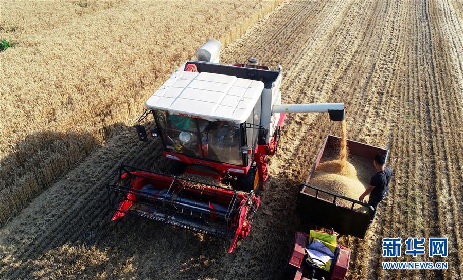 6月1日,收割机在山东省临沂市郯城县郯城街道陵坡村田间收割小麦(无人机拍摄)。 新华社发(张春雷 摄)