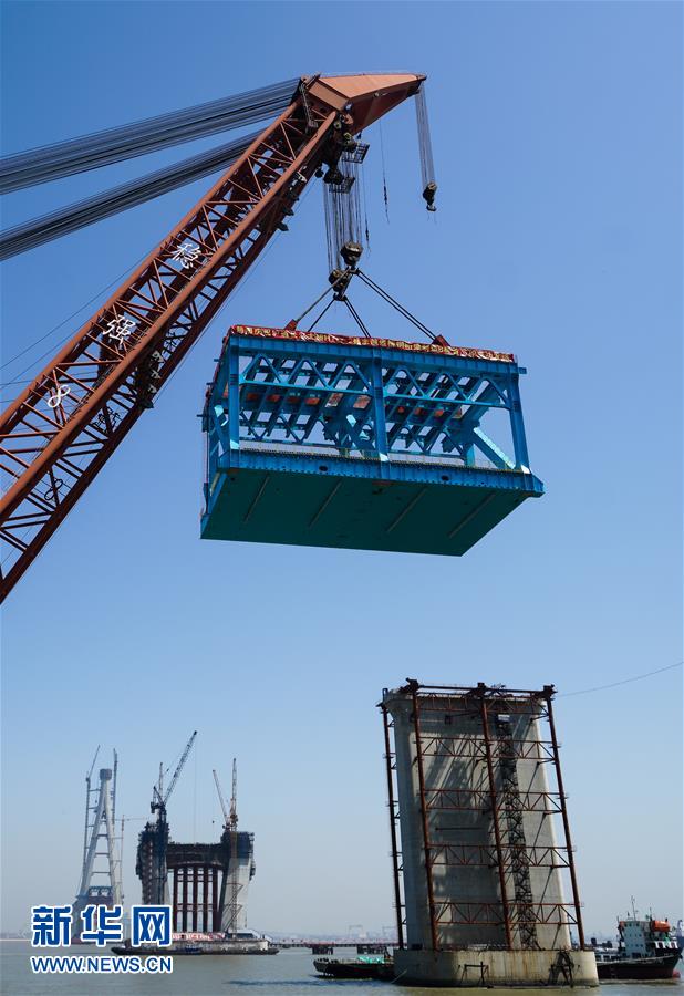 6月1日,施工人员在架设沪通长江大桥首个超千吨大节段钢梁。新华社记者 李响 摄